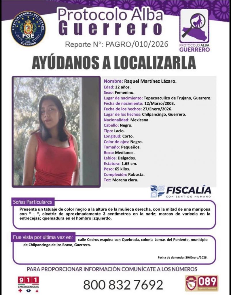 Chilpancingo, Gro., 25 de febrero (PlanB).- A casi un mes de la desaparición de Raquel Martinez Lázaro, estudiante de Derecho de la Universidad Autónoma de Guerrero (UAGro), no hay ningún indicio sobre su paradero, mientras su madre Celia Martinez Lázaro continúa su solitaria búsqueda.