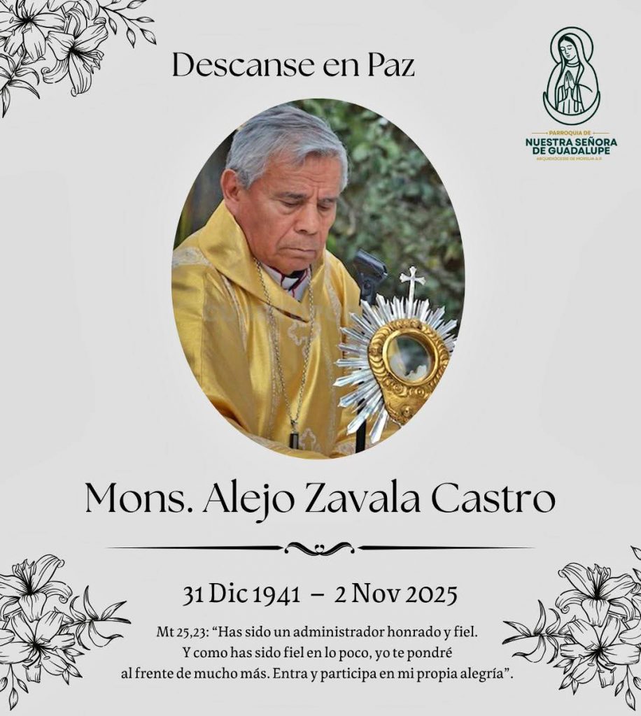 Y que para el 1 de diciembre al mediodía “estarán llegando sus cenizas de monseñor, Alejo Zavala Castro para tener la eucaristía con todo el presbiterio y pueblo de Dios en la Catedral de san Agustín, para después colocar sus cenizas en el nicho donde serán ubicadas”.