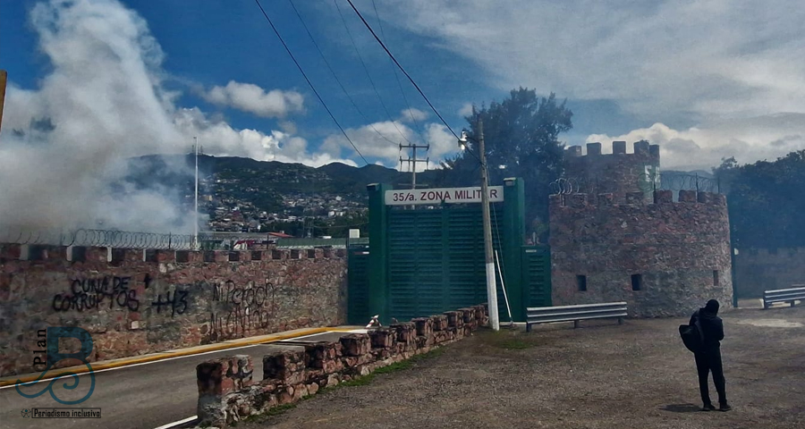 Chilpancingo, Gro., 22 de septiembre (PlanB).- Normalistas de Ayotzinapa arremetieron con una treintena de petardos que lanzaron al interior de las instalaciones de la 35 Zona Militar en Chilpancingo, desde el interior los soldados colocaron un audio de voz en donde pedían una manifestación pacífica sin que se generaran hechos de violencia