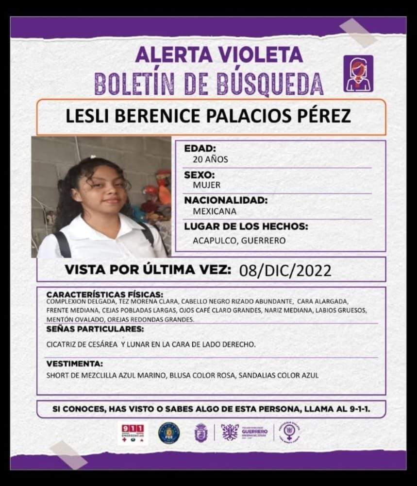 Lesli Berenice Palacios Pérez de 20 años fue vista por última vez el 8 de diciembre y es originaria de Acapulco. Ella viste un short de mezclilla azul marino, blusa color rosa y sandalias color azul.