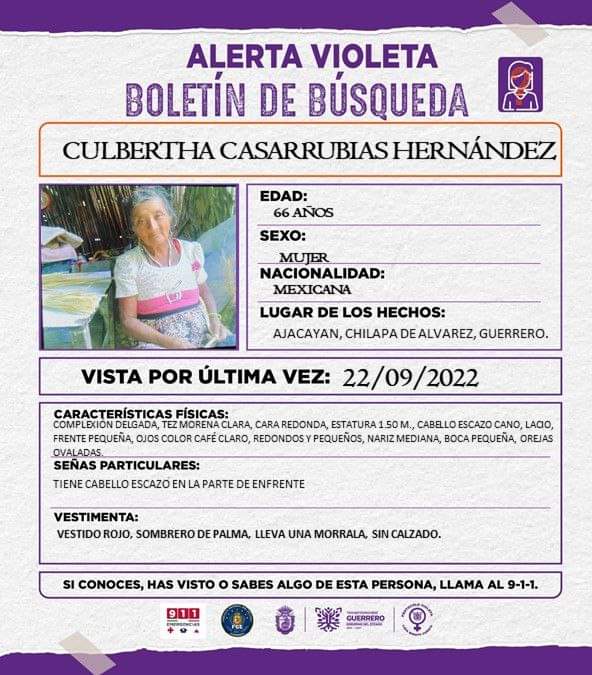 Culbertha Casarrubias Hernández tiene 66 años y es originaria de Ajacayán, municipio de Chilapa, y fue vista por última vez el 22 de noviembre; se informó que viste un vestido rojo, sombrero de palma, lleva una morrala y va sin calzado.