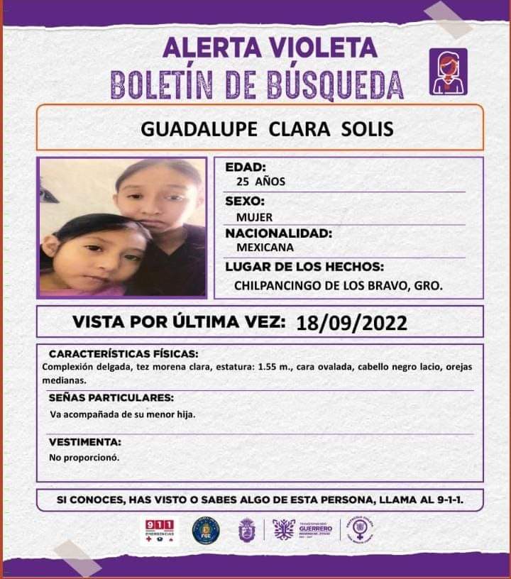 Guadalupe Clara Solís tiene 25 años y es originario de Chilpancingo, fue vista por última vez el 18 de septiembre. Ella no se proporcionaron características sobre su vestimenta.