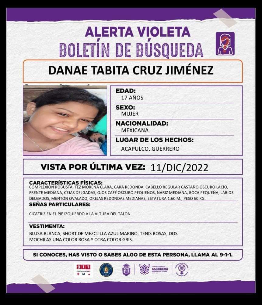 La primera es sobre la búsqueda de Danae Tabita Cruz Jiménez de 17 años originaria de Acapulco, quien fue vista por última vez el 11 de diciembre; de acuerdo con la ficha viste blusa blanca, short de mezclilla azul marino, tenis rosas y lleva dos mochilas una rosa y otra gris.