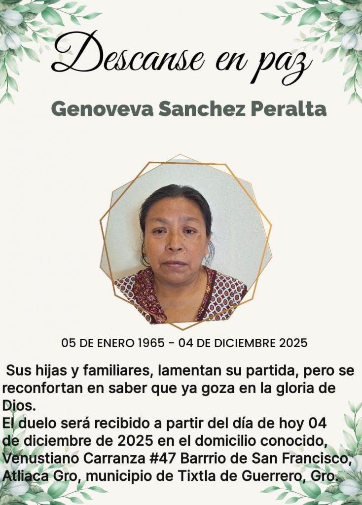 Chilpancingo, Gro., 04 de noviembre (PlanB).- Este jueves, 4 de diciembre de 2025, falleció doña Genoveva Sánchez Peralta, madre de Israel Caballero Peralta, uno de los 43 estudiantes de la Normal Rural de Ayotzinapa que fueron desaparecidos en 2014 en la Ciudad de Iguala.