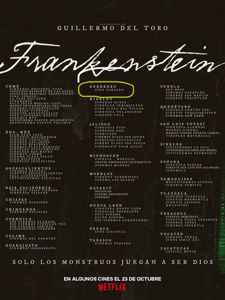 Chilpancingo, Gro., 15 de octubre (PlanB).- La nueva adaptación cinematográfica de Frankenstein, dirigida por el cineasta mexicano, Guillermo del Toro se estrenará la próxima semana en salas de 28 estados del país y donde se incluye al Cine Hidalgo de Huamuxtitlán en la región de la Montaña de Guerrero.