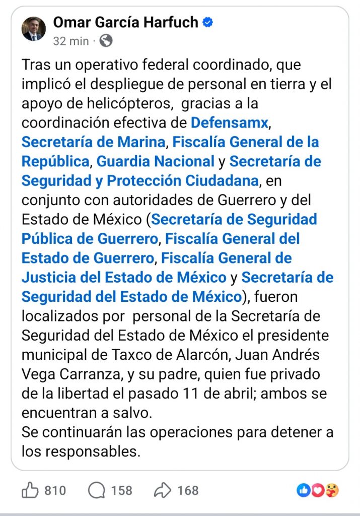 Detalló que al alcalde y a su padre los localiaron por personal de la Secretaría de Seguridad Pública del Estado de México «ambos se encuentran a salvo. Se continuarán las operaciones para detener a los responsables» aseveró el secretario de Seguridad Pública Federal.