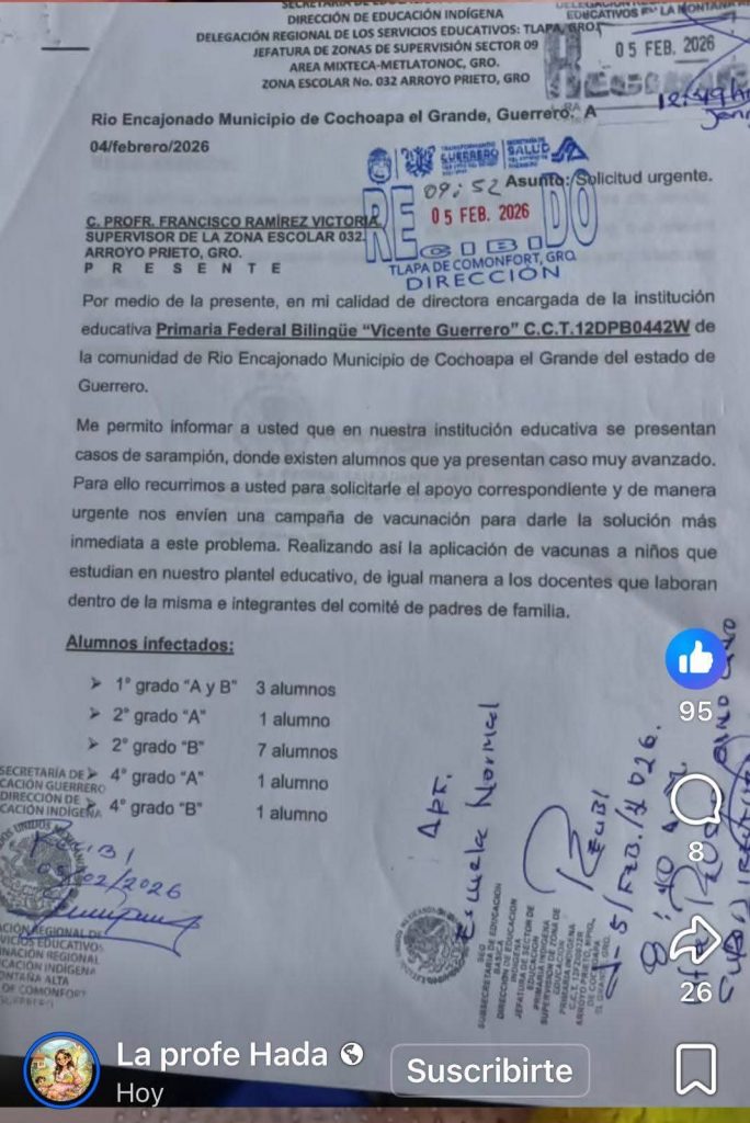 En un video en sus redes sociales la maestra Hada, indicó que desde el pasado 5 de febrero refirieron un documento a la Secretaría de Salud Guerrero, a la Secretaría de Educación y otras autoridades estatales sobre este brote, donde pedían el envío de una brigada de vacunación.