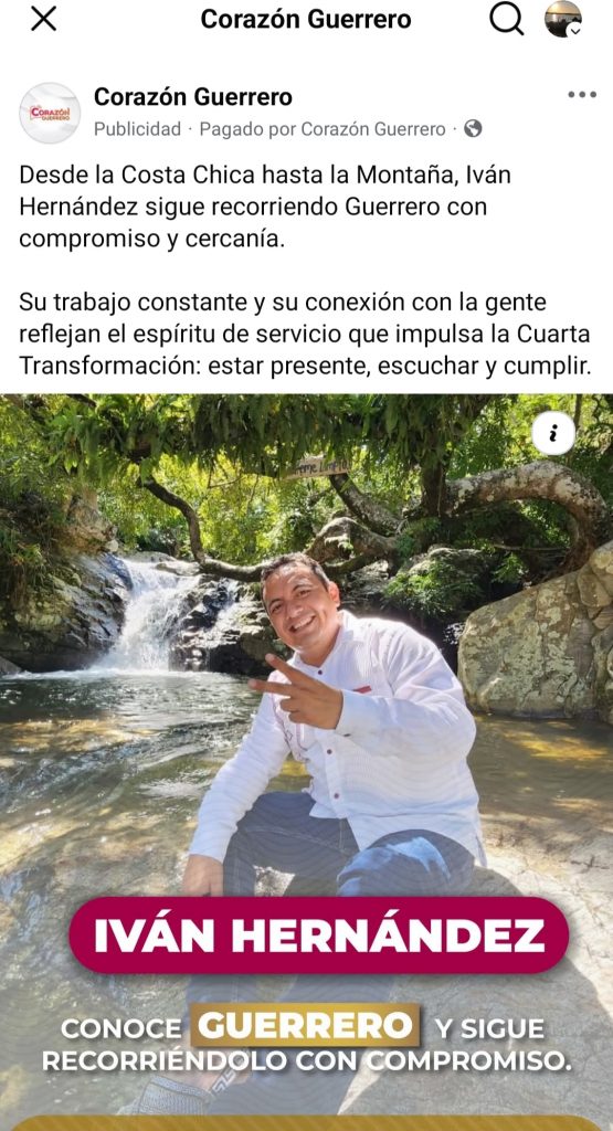 En otra publicación de “Corazón Guerrero” aparece el delegado del Bienestar en un río y lo acompaña el texto “Desde la Costa Chica hasta la Montaña, Iván Hernández sigue recorriendo Guerrero con compromiso y cercanía. Su trabajo constante y su conexión con la gente reflejan el espíritu de servicio que impulsa la Cuarta Transformación: estar presente, escuchar y cumplir”.