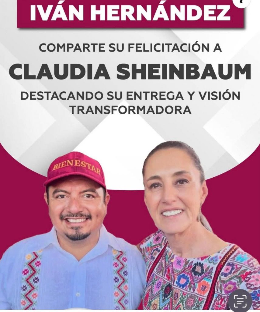En Facebook esa campaña que se aprecia es con miras a un puesto de elección popular en el 2027, se maneja con fotografías y mensajes; en una de esa publicidad pagada se aprecia al delegado del Bienestar, Iván Hernández Díaz con la presidenta, Claudia Sheinbaum Pardo y acompaña el siguiente mensaje “Iván Hernández comparte su felicitación a Claudia Sheinbaum destacando su entrega y visión transformadora”.