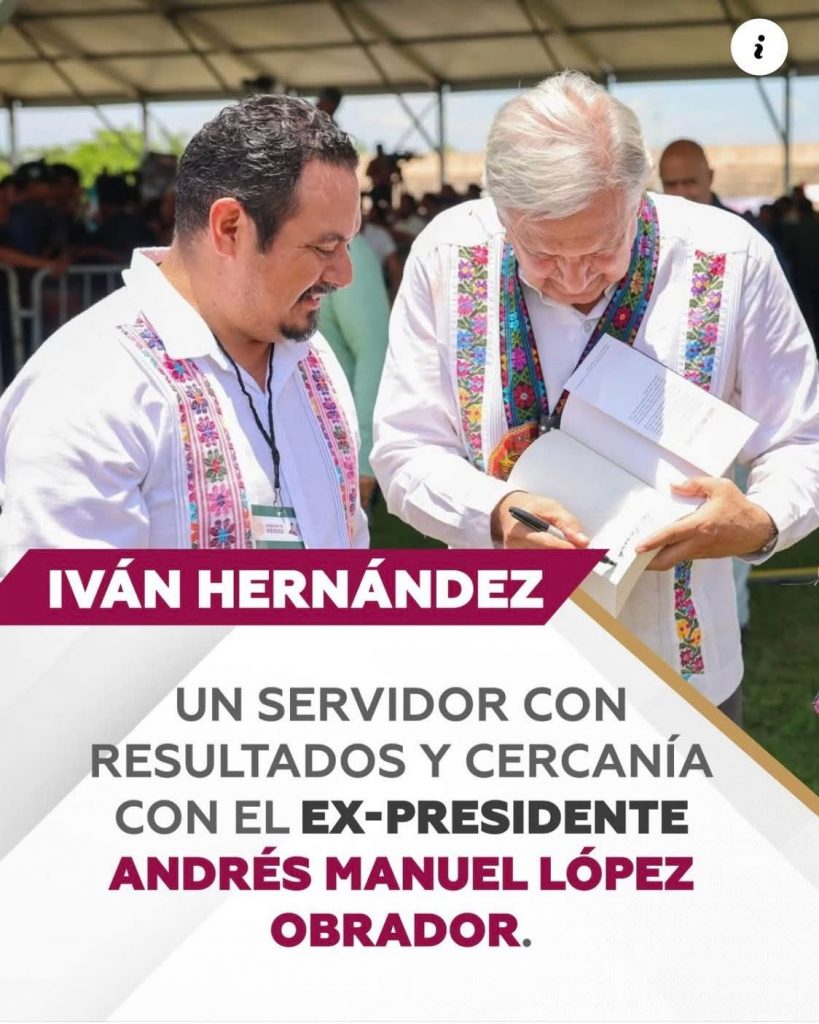En otra publicidad hay una fotografía de Hernández Díaz con el entonces presidente, Andrés Manuel López Obrador y lo acompaña el mensaje, “Iván Hernández un servidor con resultados y cercanía con el ex presidente Andrés Manuel López Obrador.