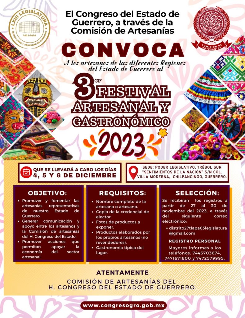 Chilpancingo.- El Congreso del Estado, a través de su Comisión de Artesanías, invita a la ciudadanía en general a participar en el Tercer Festival Artesanal y Gastronómico 2023, a realizarse los días 4, 5 y 6 del presente mes en las instalaciones de este Poder Legislativo.