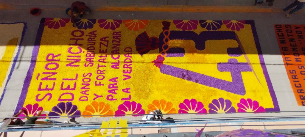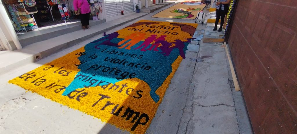 En esa misma calle más adelante se elaboró otro tapete en donde le piden al Señor del Nicho “Líbranos de la violencia y protege a los migrantes de la ira de Trump”.