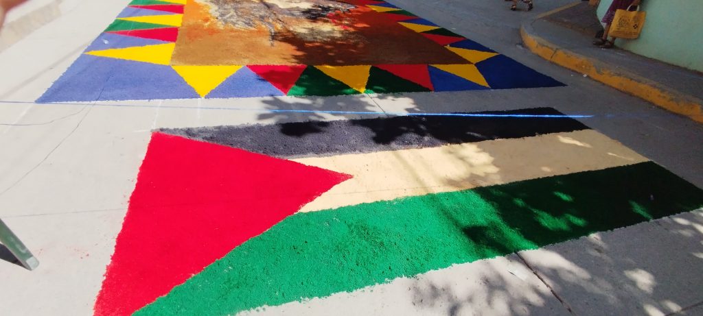 Sobre la calle Guerrero, cerca de la Clínica de Salud, unos muchachos elaboraron con aserrín una enorme bandera de Palestina y arriba una enorme figura del Señor del Nicho; los muchachos que lo elaboraron indicaron que era para pedir un alto al genocidio que Israel está cometiendo contra la nación Palestina.