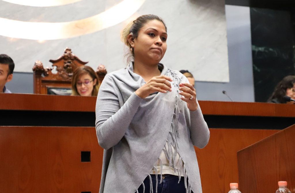 Gabriela Palomares Romero con discapacidad auditiva, dijo que falta mucho por hacer porque las personas sordas son discriminadas y rezagadas; en lengua de señas expresó en tribuna que ella enseña a su hija hipoacúsica a comunicarse.