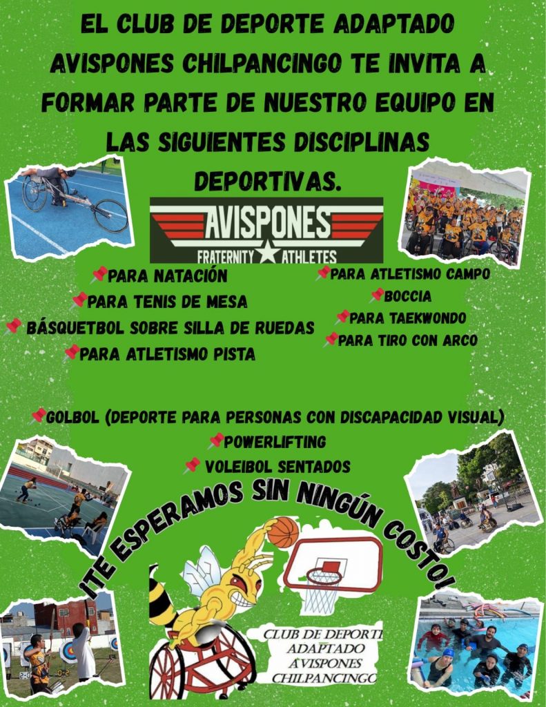 Diego Reyna reiteró la invitación a la población con discapacidad para sumarse a los equipos de las diferentes disciplinas del deporte adaptado, y dijo que para mayores informes está a disposición la página de Facebook: Club de Deporte Adaptado «Avispones» Chilpancingo.